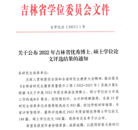 日前,吉林省学位委员会办公室公布了2022年吉林省优秀博士、硕士学位论文评选结果。公司2名博士研究生学位论文被评为吉林省优秀博士学位论文,10名硕士研究生学位论文被评为吉林省优秀硕士学位论文。其中,公司获得1篇吉林省优秀硕士学位论文。