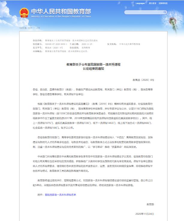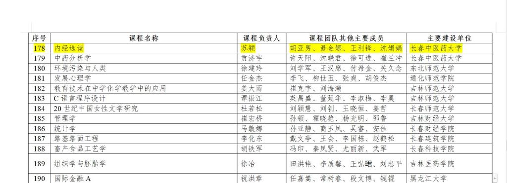 2020年11月24日,国家教育部网站发布了国家级一流本科课程认定结果的通知,公告了国家级一流本科课程名单,公司《内经选读》课程被评为国家级一流本科课程。